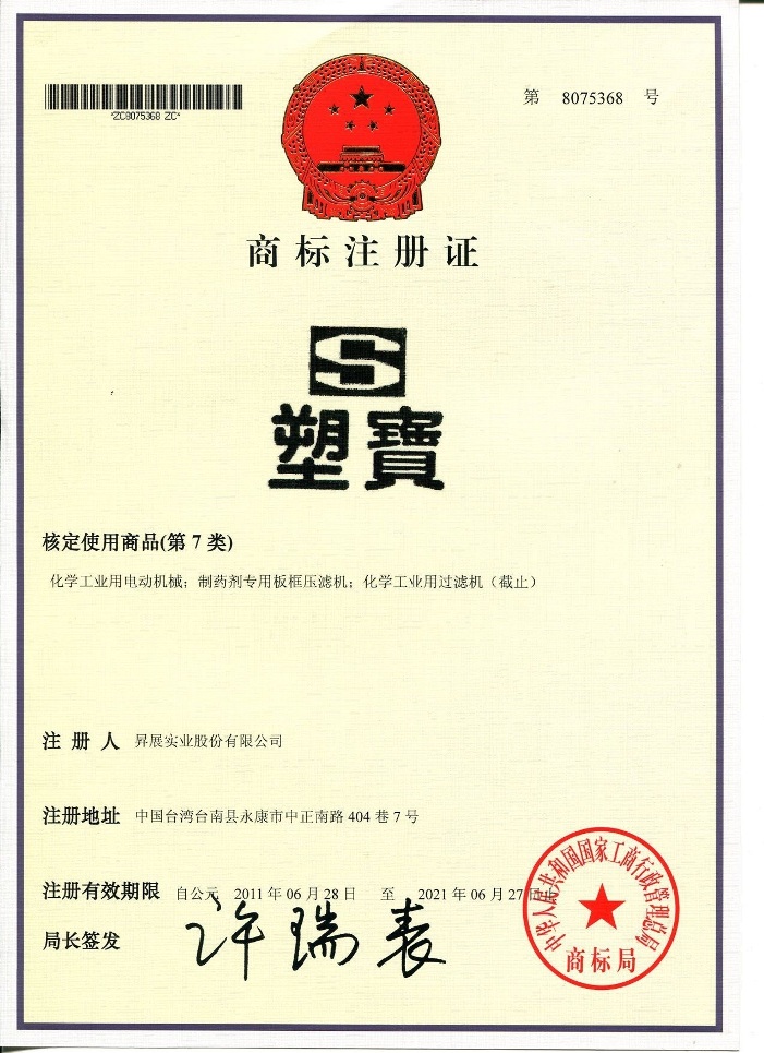 下列各式商標(biāo)為本公司于大陸取得之商標(biāo)注冊(cè),僅授權(quán)太倉(cāng)市塑寶環(huán)保機(jī)械及增城市升展機(jī)械公司使用,其余非經(jīng)我司書(shū)面許可而濫用者,本公司將采取法律行動(dòng),追索侵權(quán)之損害賠償。